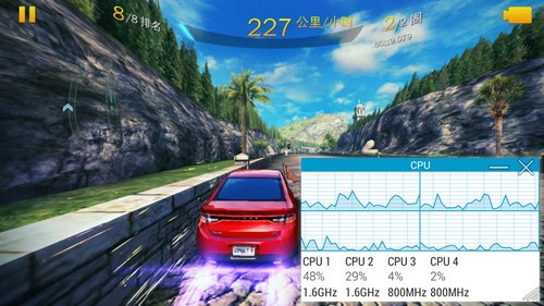 A15的性能还是可见一斑的,10分钟内四个核心的使用状况都不是很多;最主要的核心1、2频率也仅有0.7GHz左右的水平,这样就可以满足大型游戏的长时间运行。