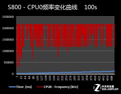 长效工作方式依然如此;Atom Z2580并没有骁龙800或者Tegra 4那样的随着时间进行、而出现阶梯状降频的现象,而是整个过程两个核心的频率都在800MHz~1.5GHz之间频繁变化,偶尔用到最高的2GHz主频。