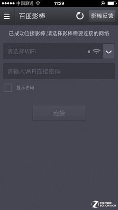 影棒与手机、影棒与WIFI路由器连接成功! 选择正确的WiFI网络并且输入正确密码后,等待几秒钟后屏幕就显示百度影棒与手机已经成功连接上。