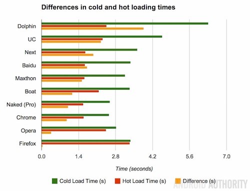 为了更好的对比,我们将这几款浏览器的冷加载时间和热加载时间放在一起。可以明显看出,虽然UC和海豚浏览器在页面加载速度上不占优势,但热启动的耗时相比冷启动有了较大的改进,这是本来加载就很快的Naked(Pro)和Chrome所做不到的。最下面的Firefox,难道你又重新加载了一遍?