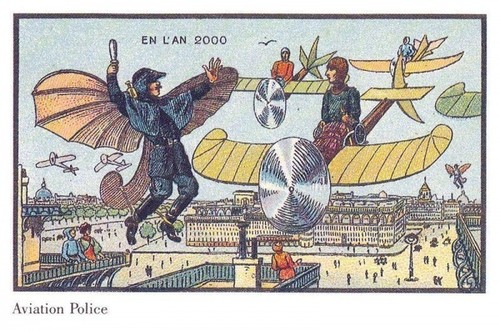这一组图出自1899年法国艺术家Jean-Marc Côté之手。他对二十世纪的图景进行了展望,然后装在雪茄盒里,在巴黎世博会期间将这些卡片分发出去。