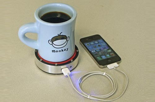 看上去像是一块金属杯垫,它的特色不需要任何外接电源,只需一杯热饮或冷饮就能帮手机充电。采用两面式设计,红色面可以把热能转换成电力,待指示灯号亮起,可通过USB连接线来帮手机、平板来充电。把冰凉的可乐或啤酒放在蓝色的那一面上,也可把低温转换成电力来充电。