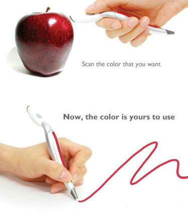 无论任何时候你看到了心仪的颜色,只需要将笔头靠近它,然后简单扫描一下,颜色的数据便立即传送到取色笔中,随即,内部的处理芯片便会控制墨盒进行精确调色,这样你就能从笔尖画出同样的颜色了。超想要有木有!