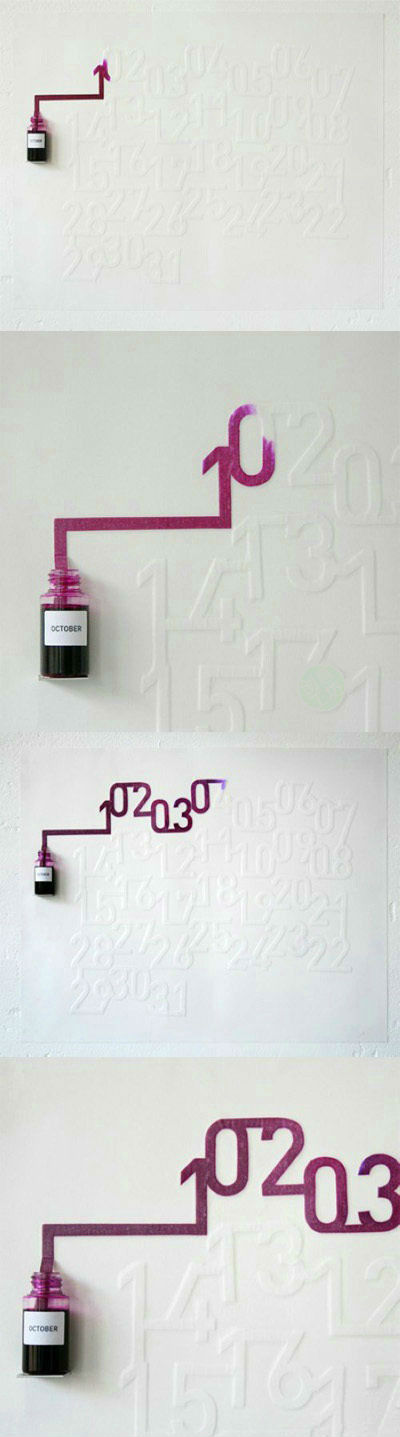 用一条贯穿整个月份的纸带浸在墨水瓶中,利用毛细管作用,有色墨水开始缓缓移动,和日出日落相匹配的速度清晰的显示出当天的日期,够个性。